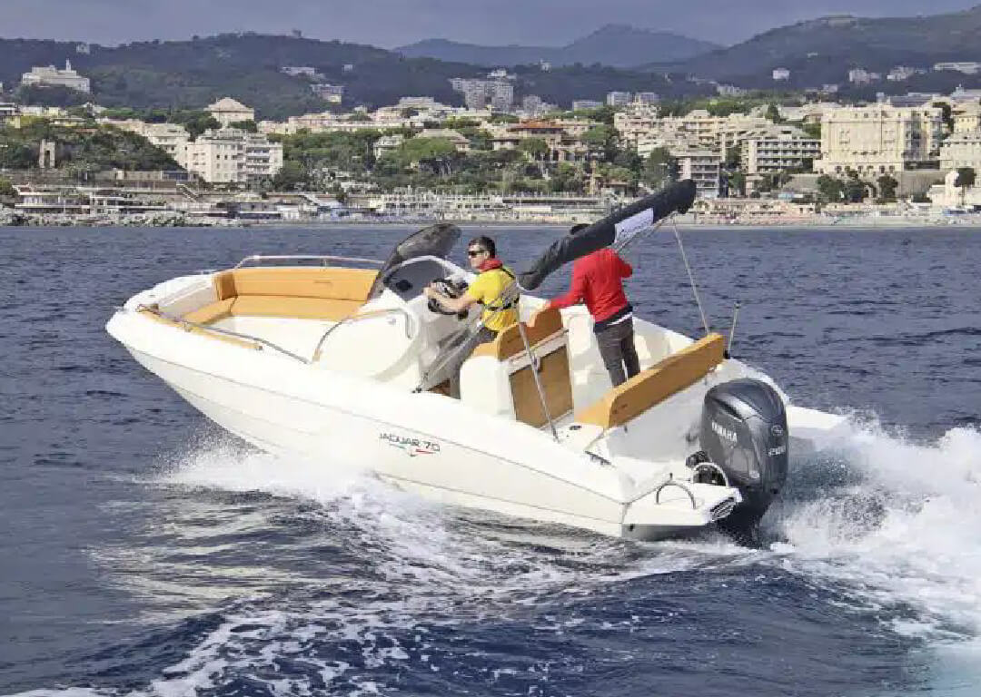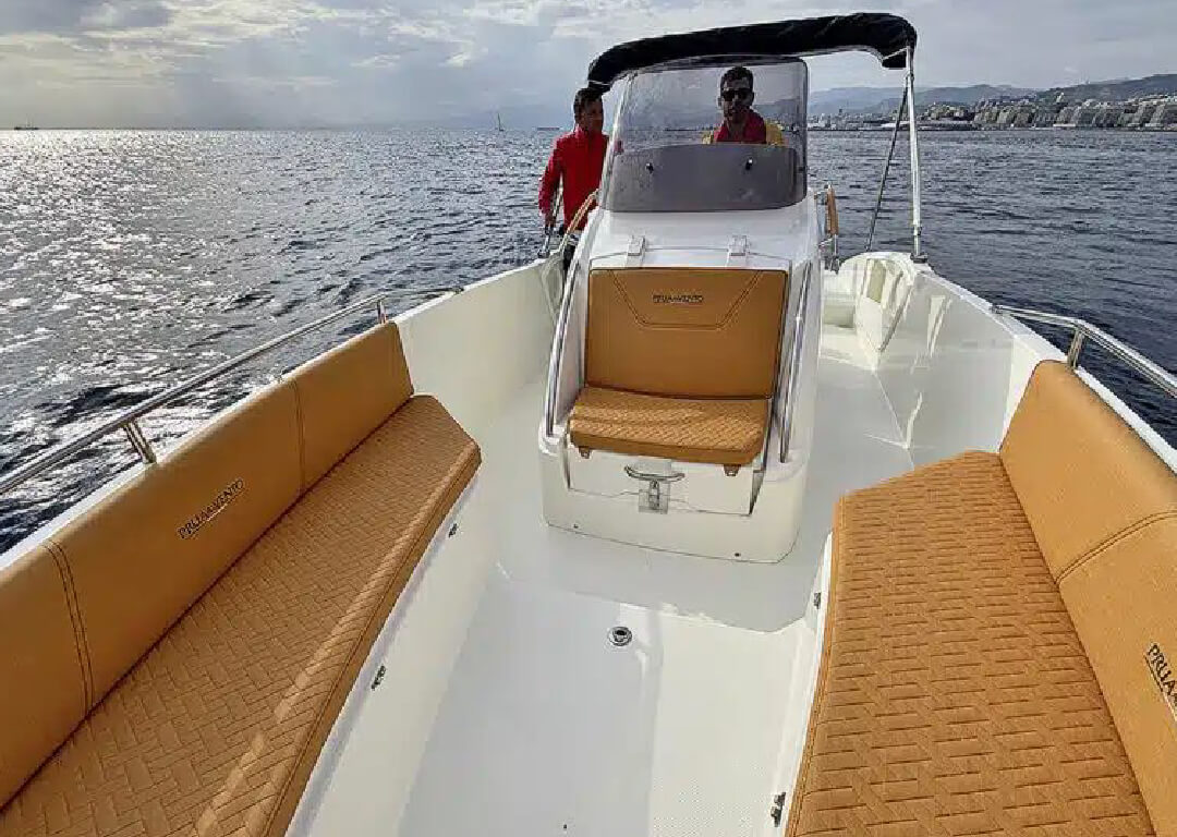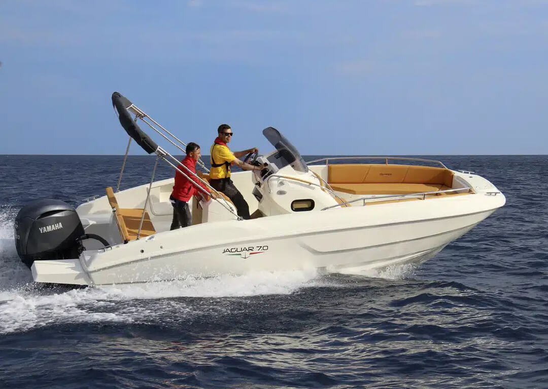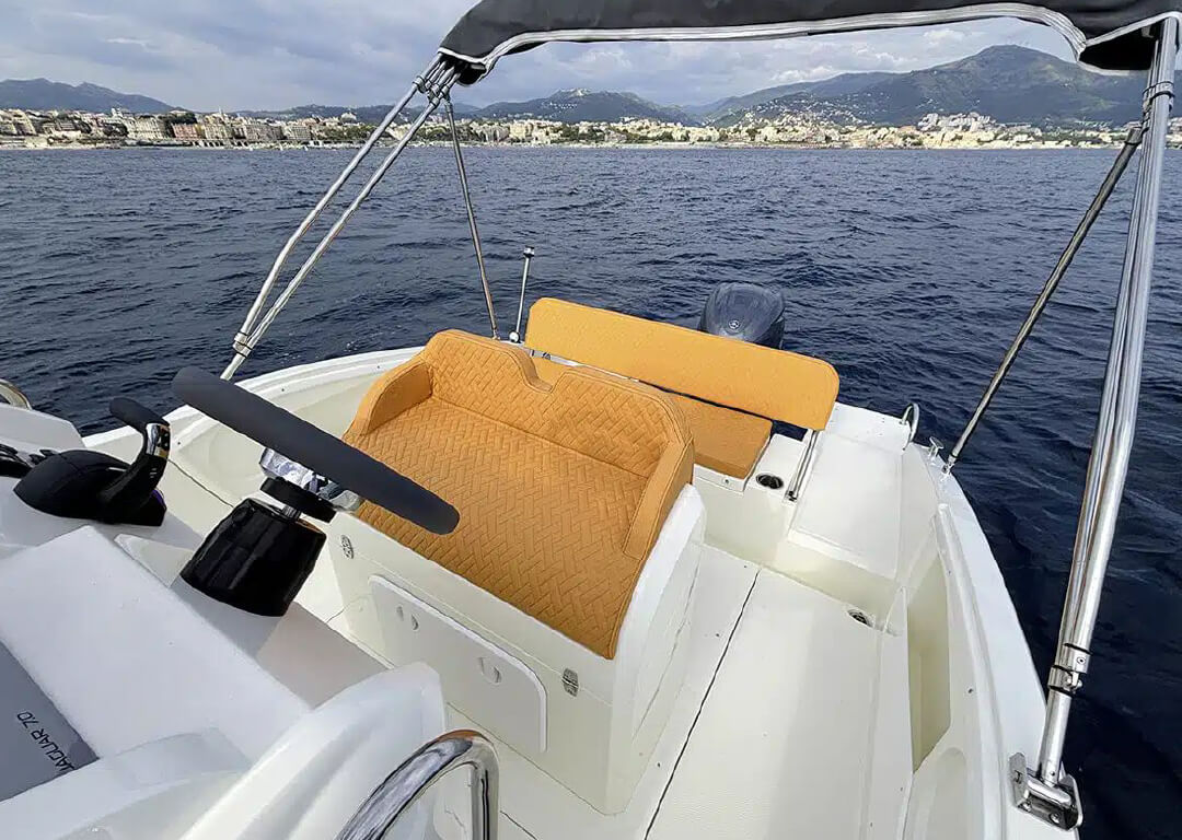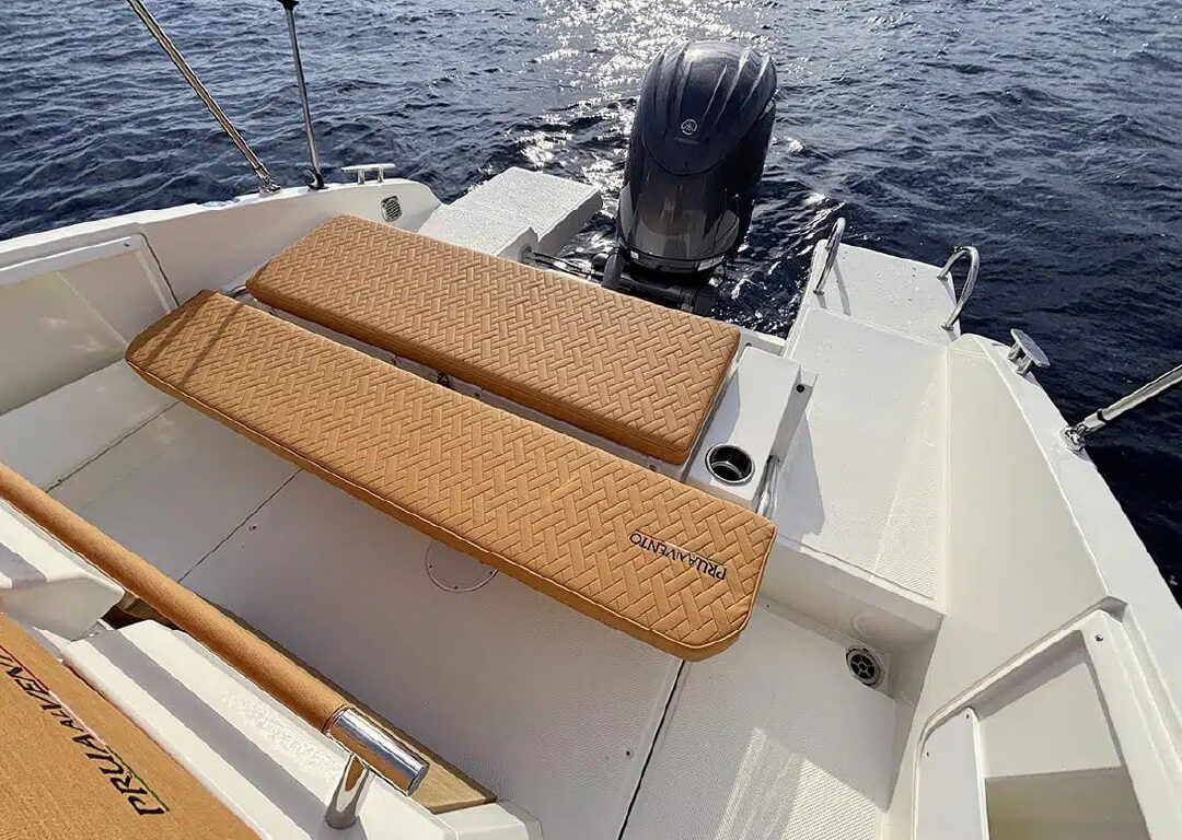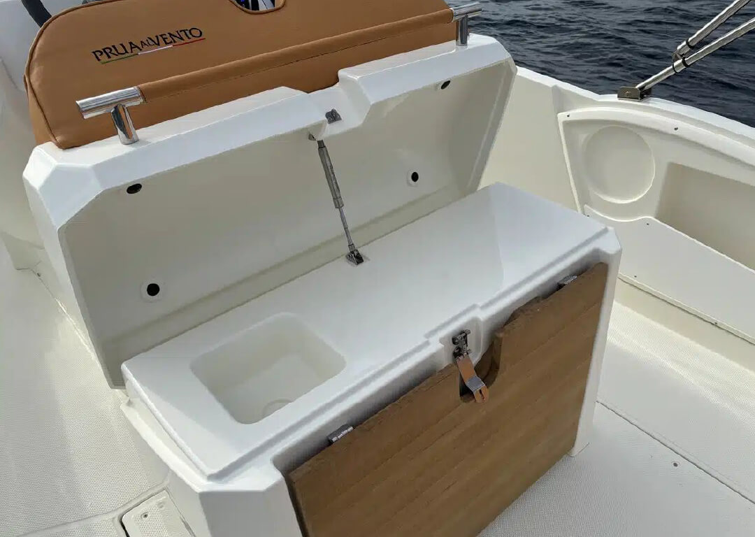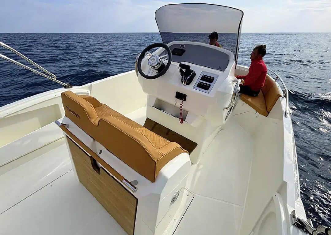 White hull color | Navigation lights | Steering wheel | Switch control panel | Waterproof electrical installation | Battery switch | Electric horn | Bilge pump | Gas struts and rubber seals on storage hatches | Stainless steel handrail | Stainless steel stern ladder | Extended plastic stern platforms | 4 mooring cleats | External cushion set | Stainless steel air vents | Helm seat with storage | Hydraulic steering system | Central console with lifting door and large storage compartment – possibility to install sink, shower and marine toilet | Built-in 215 L fuel tank
