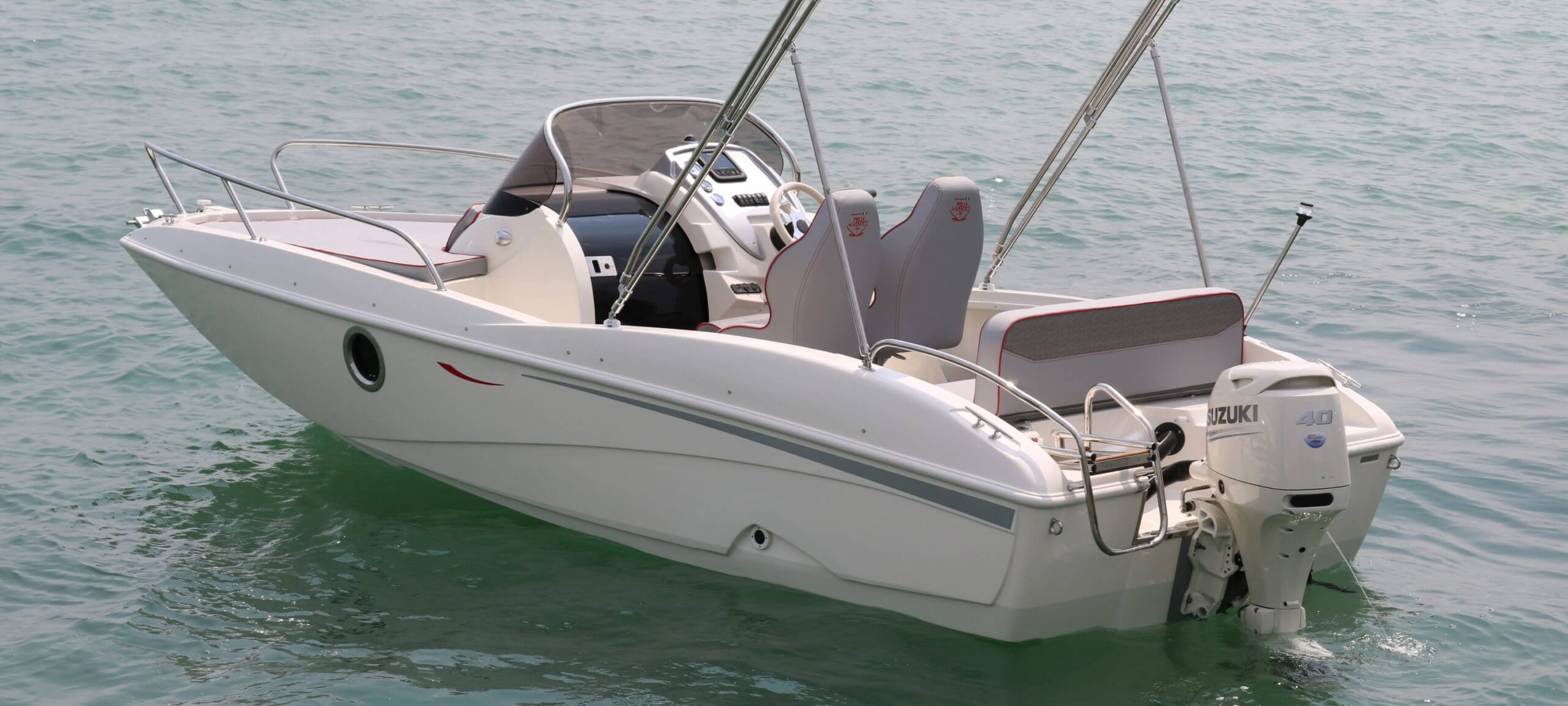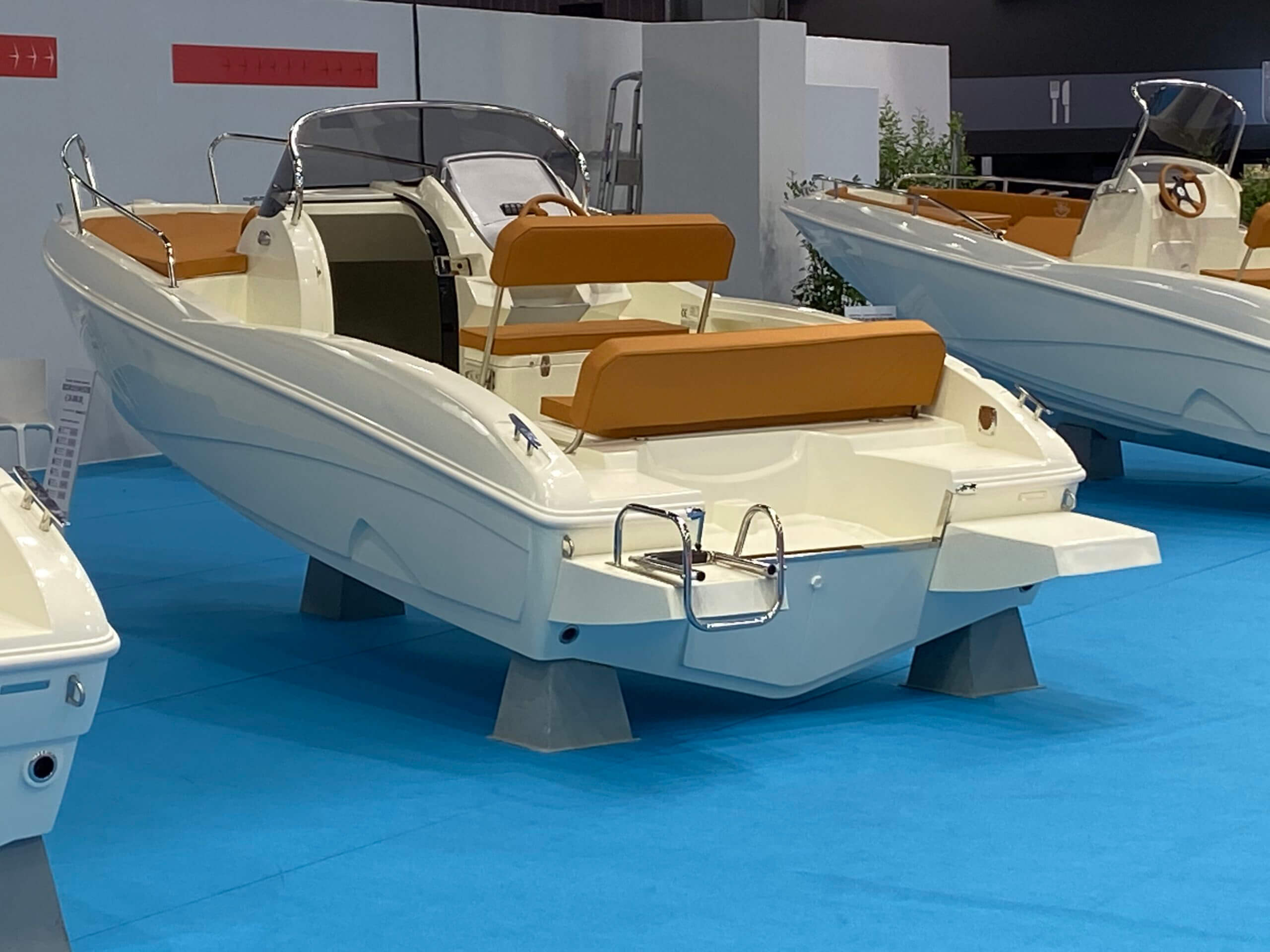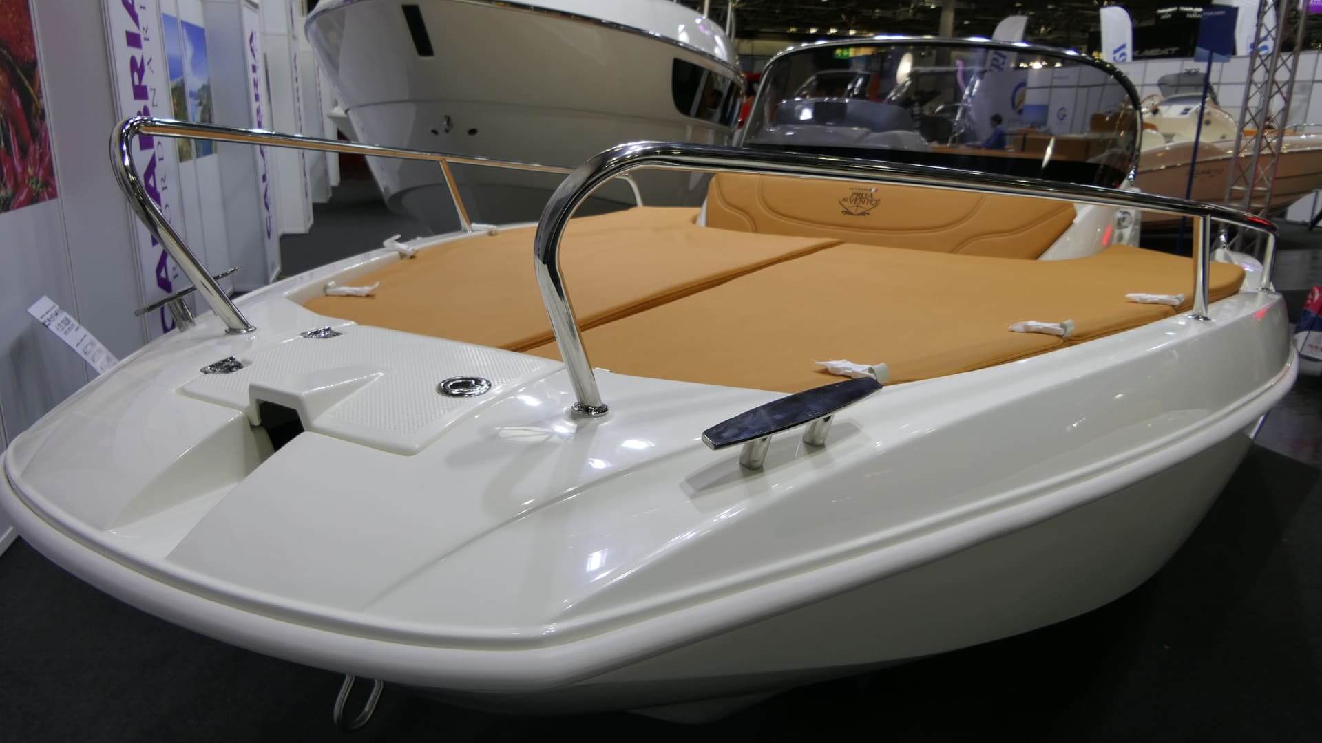 white hull color | navigation lights | bilge pump | steering wheel | control panel with switches | electric horn | electric main switch | stainless steel handrail | stainless steel stern ladder with handrail | mooring cleats | cushion set | stainless steel air vents | helm seat | stainless steel backrest with 5-point adjustment | built-in 120 L fuel tank