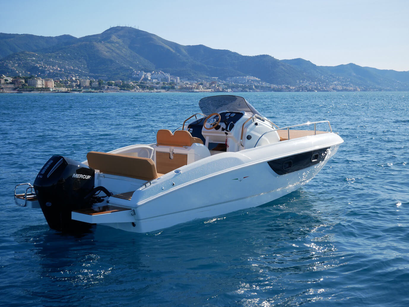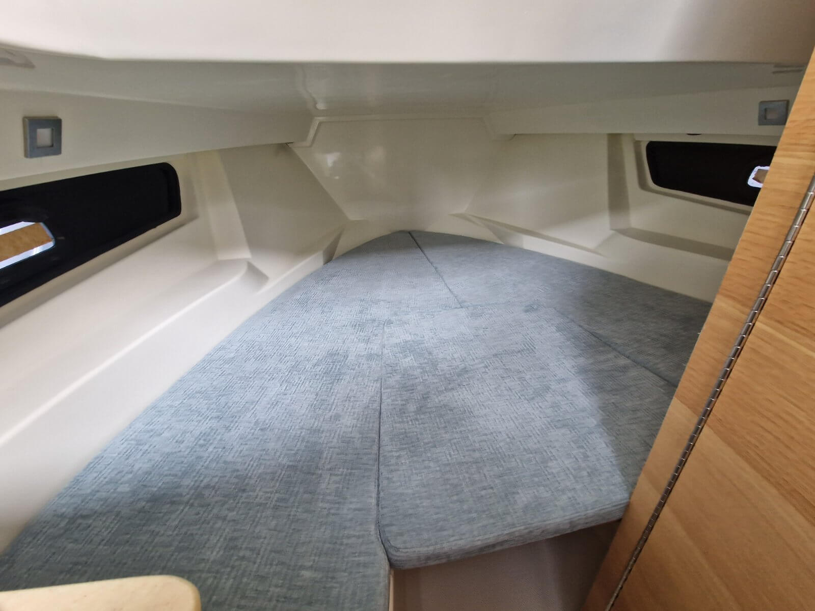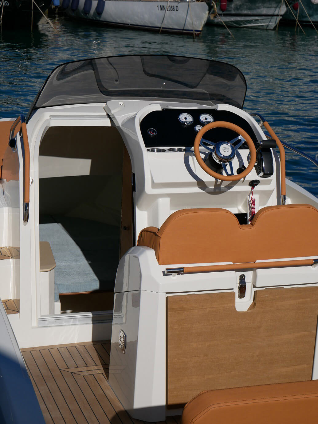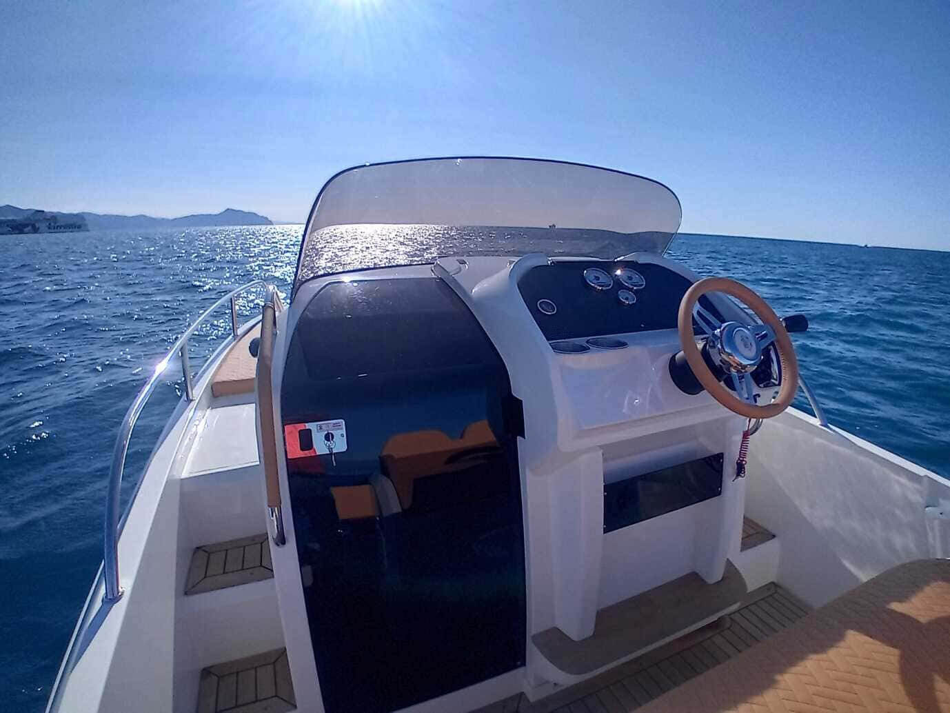 white hull color | navigation lights | bilge pump | steering wheel | control panel with switches | electric horn | electric main switch | stainless steel handrail | fiberglass stern platforms | stainless steel stern ladder with handrail | mooring cleats | exterior cushion set | stainless steel air vents | helm leaning post with storage | cabin sliding plexiglass door with lock | cabin cushions | cabin ceiling light | preparation for installing a WC partition panel | hydraulic steering system | built-in 215 L fuel tank