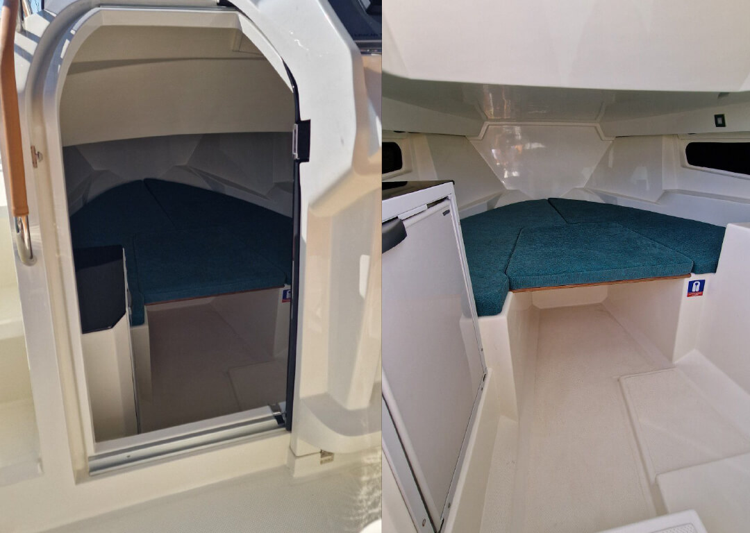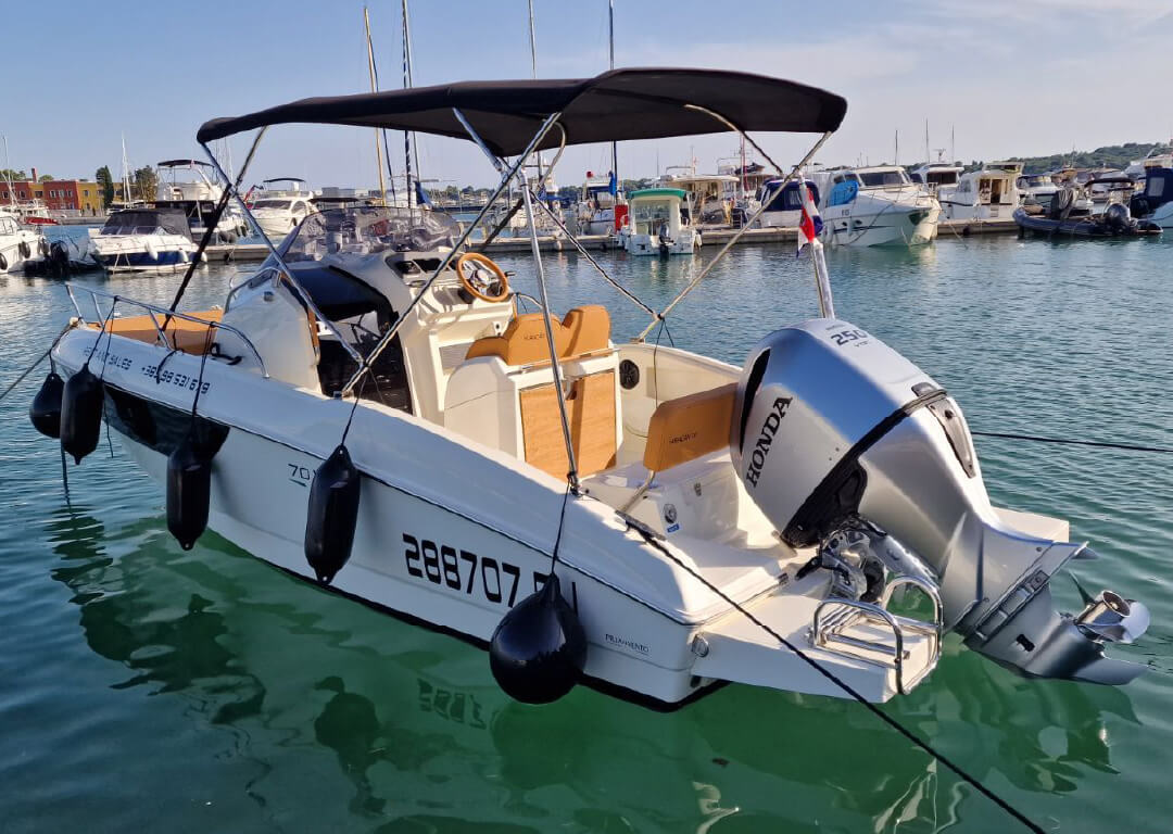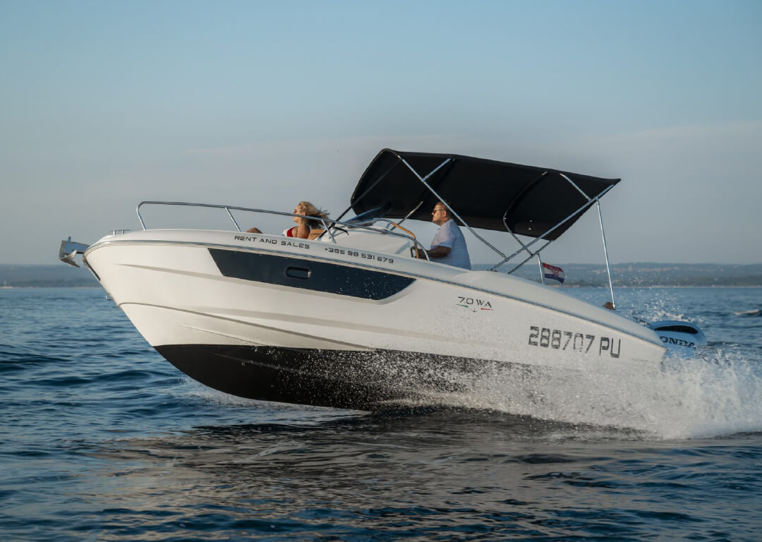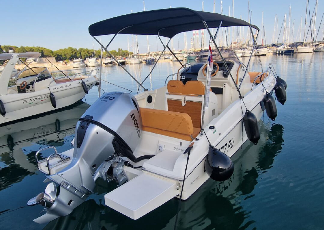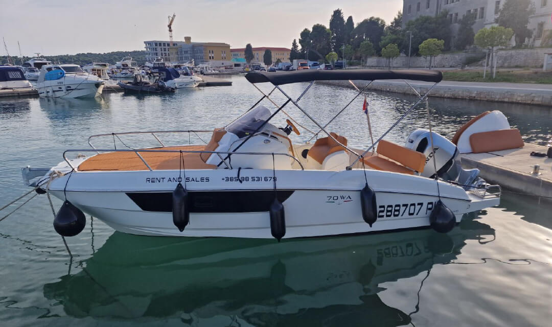 Welcome aboard Prua al vento WA 7.0, your perfect partner for an unforgettable day on the crystal-clear waters of the Adriatic! Based in Marina Polesana Pula, Croatia, this refined walkaround blends sleek Italian design with practical luxury, making it an ideal choice for both day trips and overnight escapes. The cabin offers a cozy retreat after a day in the sun, featuring elegant finishes, smart use of space, and just the right touch of nautical charm. Whether you’re seeking a romantic evening anchored under the stars or a tranquil break from the waves, the cabin is your personal sanctuary.